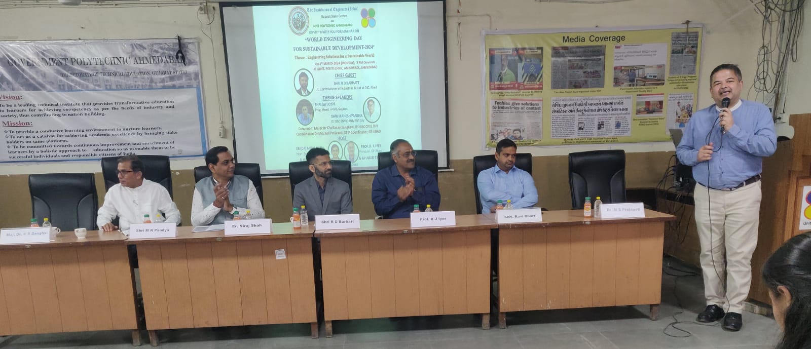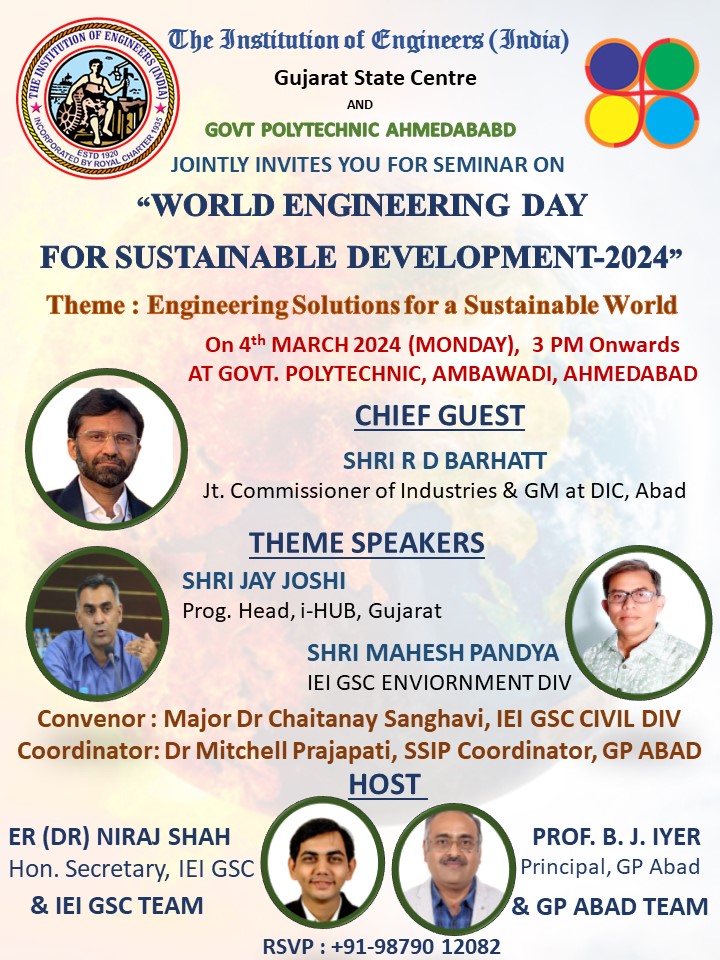 World Engineering Day for Sustainable Development 2024, Theme: Engineering Solutions for a Sustainable World, in collaboration with The Institutions of Engineers ( India ) - Gujarat State Chapter on 4 March 2024, at S V Hall, Government Polytechnic Ahmedabad.